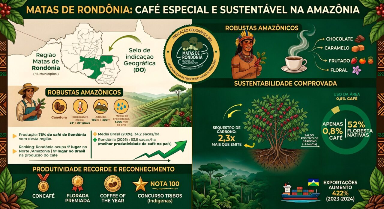 A região Matas de Rondônia, situada entre o cenário amazônico e o cerrado é responsável por 75% da produção de café do estado, contribuindo para a conquista de Rondônia no 1º lugar em produção de café da Região Norte e no bioma amazônico; e do 5º lugar no Brasil. Produz um tipo de café único no mundo, cultivado com práticas agrícolas sustentáveis. A produção recebeu, em 2021, o Selo Indicação Geográfica (IG), do tipo denominação de Origem (DO), concedido pelo Instituto Nacional da Propriedade Industrial (Inpi), vinculado ao Ministério do Desenvolvimento, Indústria, Comércio e Serviços (MDIC). É o reconhecimento do sabor, qualidade e sustentabilidade do café das Matas de Rondônia.