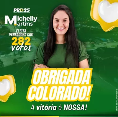 Em uma mensagem de gratidão, Michelly Martins, (PRD) a segunda candidata mais votada entre os 33 candidatos a vereador que apoiaram o prefeito Edinho da Rádio nas coligações PRD, PL e PP, expressa sua profunda gratidão ao povo coloradense. Recebendo 282 votos, Michelly afirma que cada voto foi conquistado de maneira totalmente orgânica, sem recursos de verba partidária e sem equipes de apoiadores fazendo campanha em seu nome. O resultado foi fruto de seu trabalho, dedicação e o apoio incondicional de amigos e familiares que acreditavam em seu potencial.