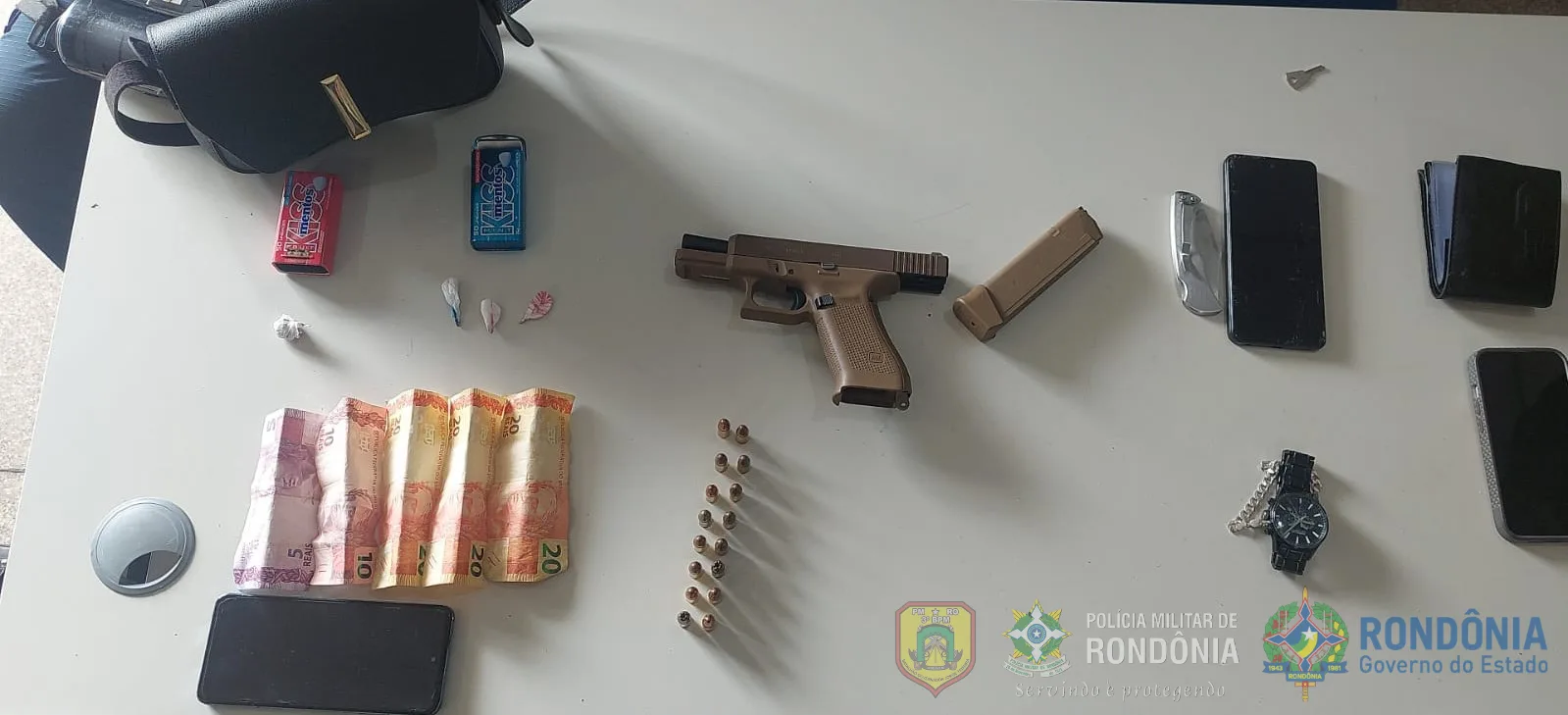 Durante a revista, os policiais localizaram com U.A.P., de 27 anos, uma pistola calibre 9 mm com registro de furto e 16 munições. Com uma mulher identificada pelas iniciais C.S.M., de 28 anos, foram encontradas porções de cocaína e maconha, além de dinheiro em espécie. No momento da chegada das viaturas, suspeitos tentaram descartar sete invólucros de entorpecentes pelo cano de respiro de uma fossa. No local, diversos invólucros vazios indicavam o consumo de drogas. Os responsáveis, V.H.F.O. e P.H.B.S., admitiram ter ignorado a ordem de fechamento do estabelecimento emitida anteriormente.