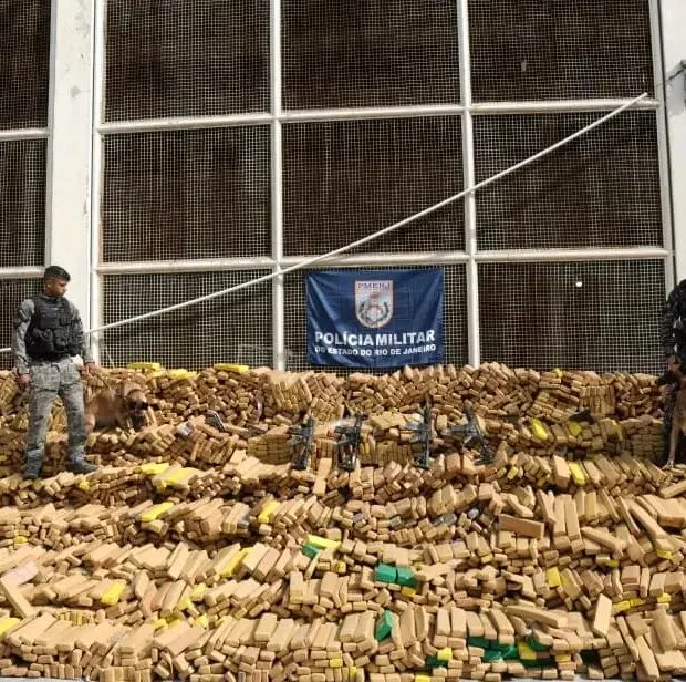 A Polícia Militar do Rio de Janeiro apreendeu, nesta quarta-feira (8), 48 toneladas de maconha no Complexo da Maré, zona norte da cidade, descobertas casualmente por um cão farejador durante uma operação de rotina contra facções criminosas.