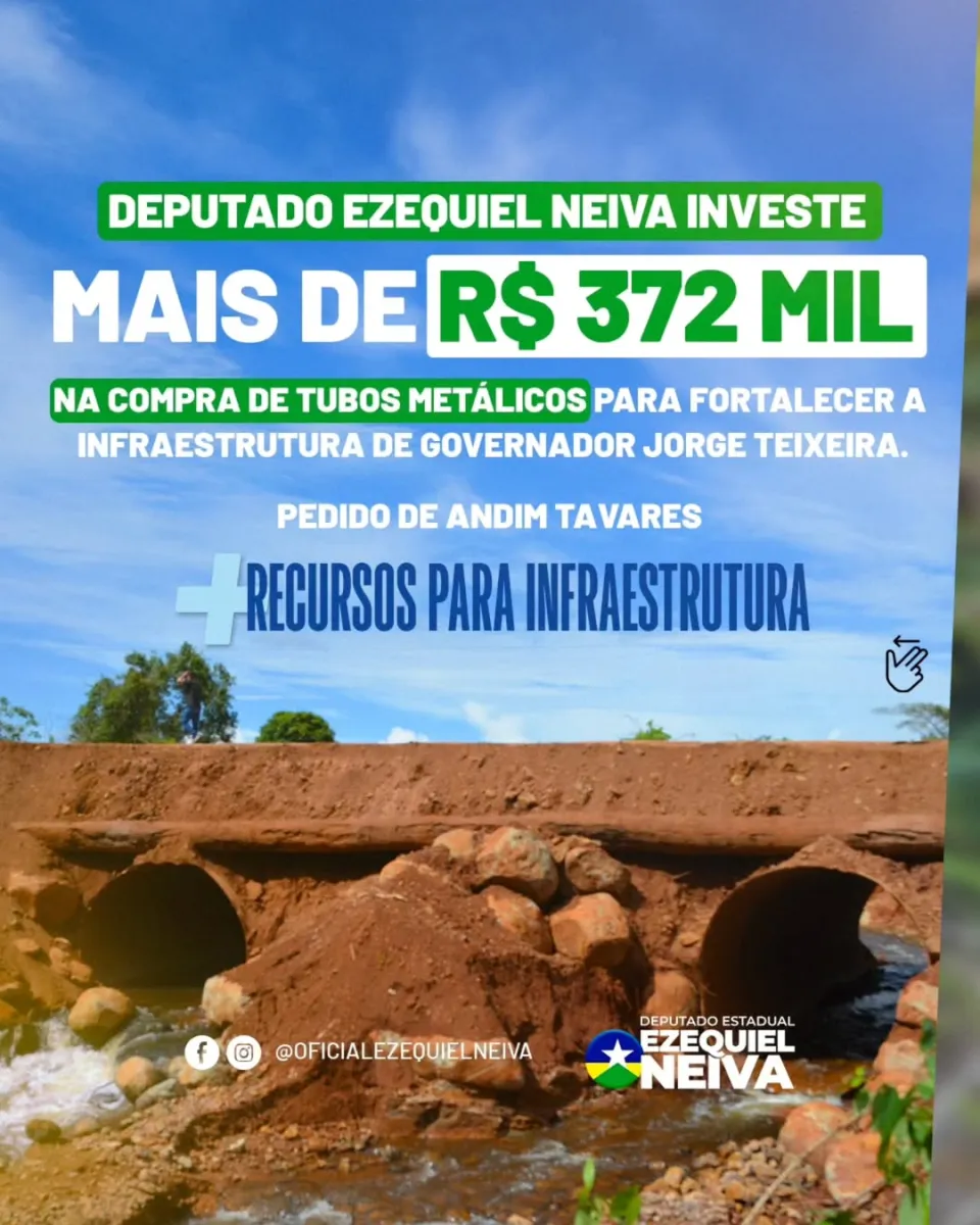 O deputado estadual Ezequiel Neiva destinou mais de R$ 372 mil para a aquisição de tubos metálicos voltados ao fortalecimento da infraestrutura do município de Governador Jorge Teixeira, em Rondônia. O investimento tem como objetivo melhorar as condições de drenagem e apoiar obras estruturais, especialmente em áreas rurais e vias que sofrem com a ação das chuvas.