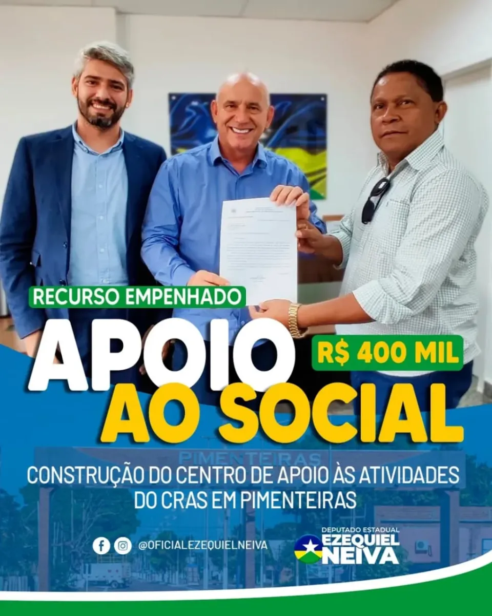 O deputado estadual Ezequiel Neiva assegurou o empenho de R$ 434 mil para a construção da cobertura e o calçamento do Centro de Referência de Assistência Social (CRAS) do município de Pimenteiras. O recurso já está oficialmente reservado no orçamento e deverá ser transferido nos próximos dias para a conta do projeto, permitindo o início das obras.