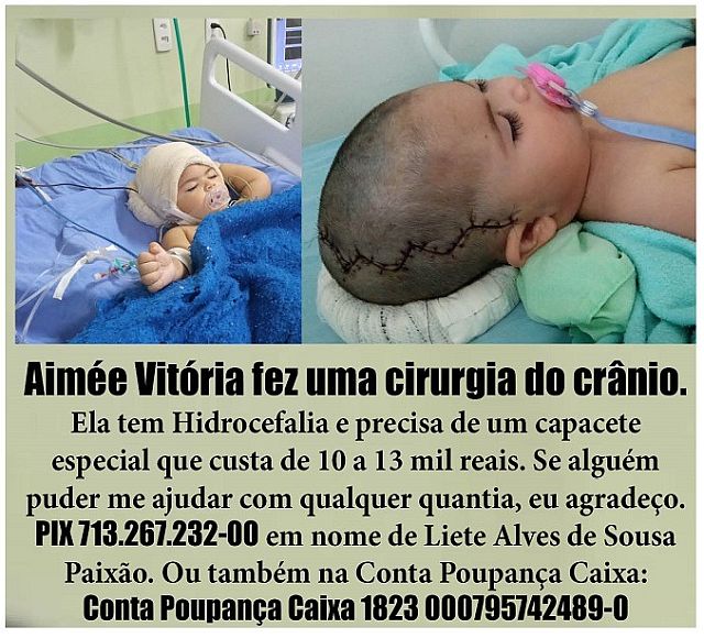 Os pais de Aimée Vitória, criança de um ano que nasceu com hidrocefalia e desenvolveu craniossinostose, estão precisando de ajuda para adquirir um capacete que a criança precisa usar, após passar por duas cirurgias (a mais recente agora em abril de 2022).