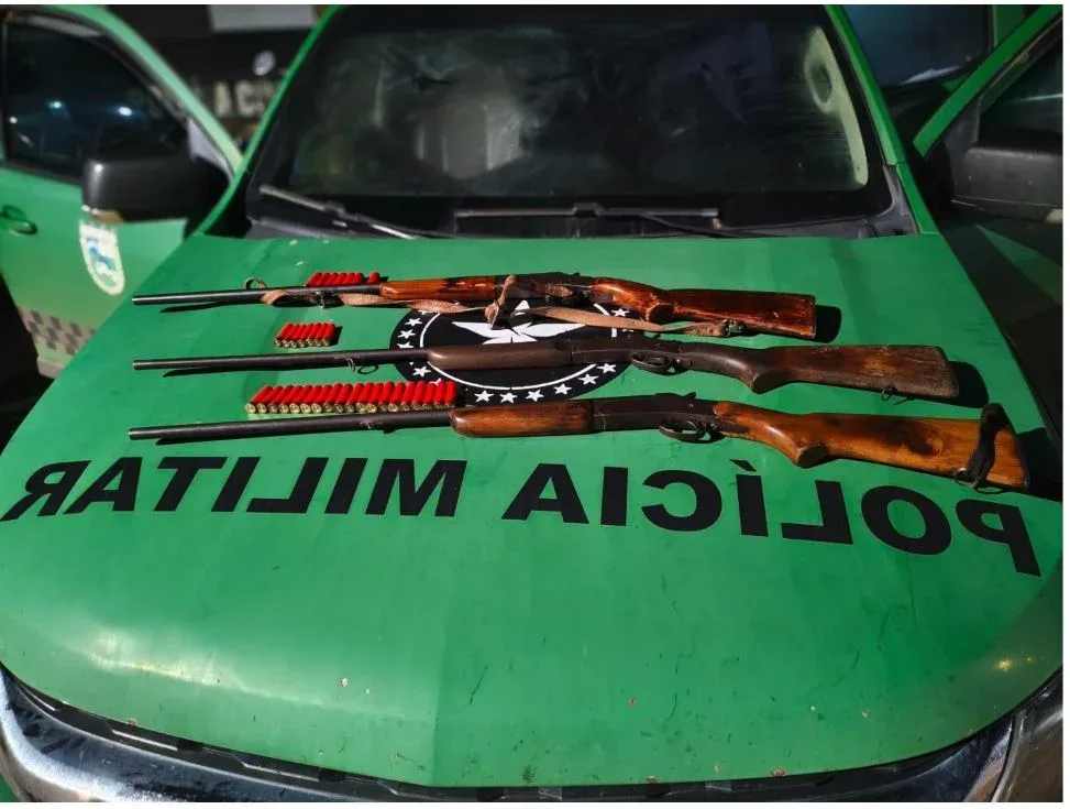Durante a revista pessoal, nada de ilícito foi encontrado com os abordados. No entanto, ao realizarem buscas nas mochilas, os policiais localizaram três espingardas: uma calibre 32, com 19 munições, uma calibre 36, com oito munições e uma calibre 28, com sete munições.