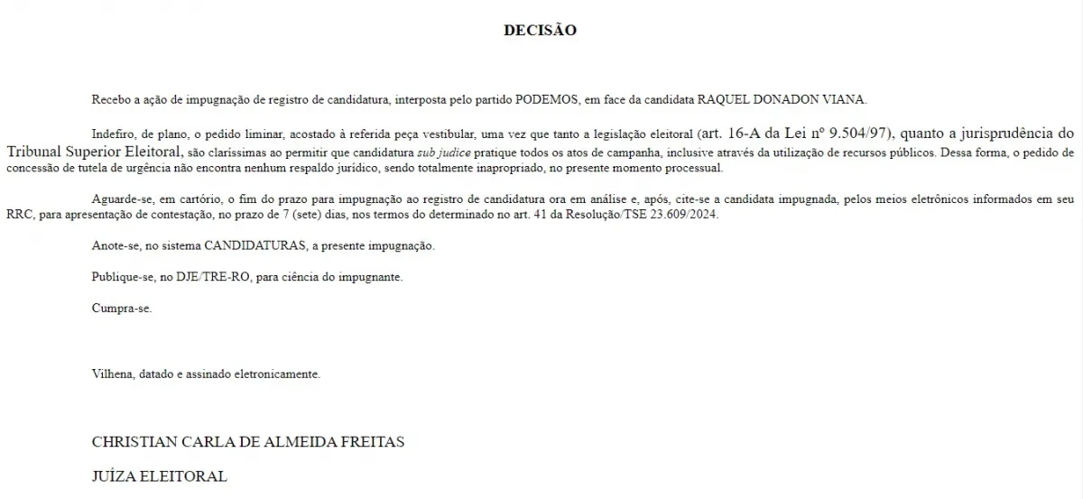 A Justiça Eleitoral reconheceu o direito de Raquel Donadon (PRD) de realizar atos de campanha e usar o Fundo Eleitoral ao negar pedido de liminar feito pelo prefeito Flori Cordeiro de Miranda Junior, que encerra seu mandato atual em dezembro. Na ação, movida por seu partido Podemos, presidido por Wagner Wasczuk Borges, a juíza emitiu decisão enfática afirmando que o pedido foi “totalmente inapropriado” e que “não encontra nenhum respaldo jurídico”.