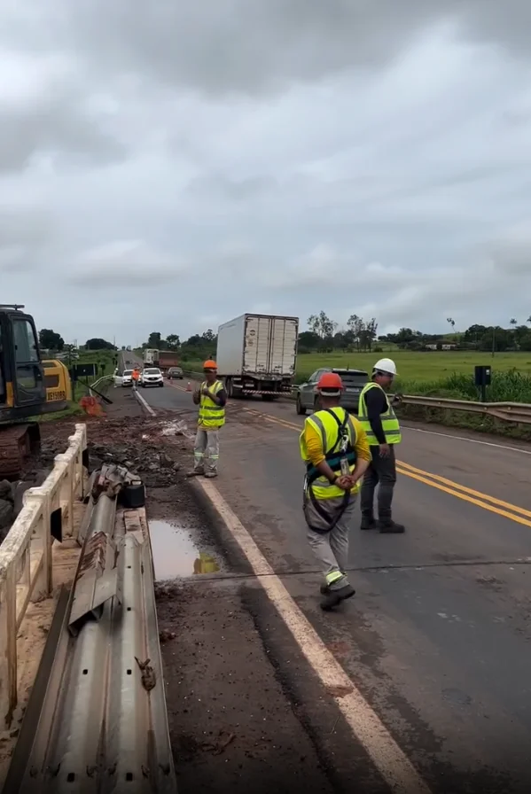 No local, equipes da concessionária responsável pela rodovia executavam serviços de contenção, com o uso de máquinas e o depósito de grande volume de pedras às margens do rio, numa tentativa de conter processos de erosão próximos à estrutura. As imagens mostram trabalhadores atuando desde as primeiras horas do dia.