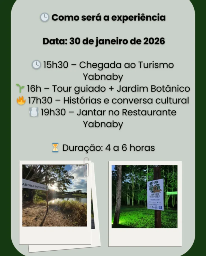 No fim da tarde, às 17h30, ocorre a roda de histórias e vivência cultural, proporcionando uma imersão nos conhecimentos ancestrais do povo Paiter Suruí. Encerrando a experiência, às 19h30, será servido um jantar no Restaurante Yabnaby, com pratos preparados no próprio local.