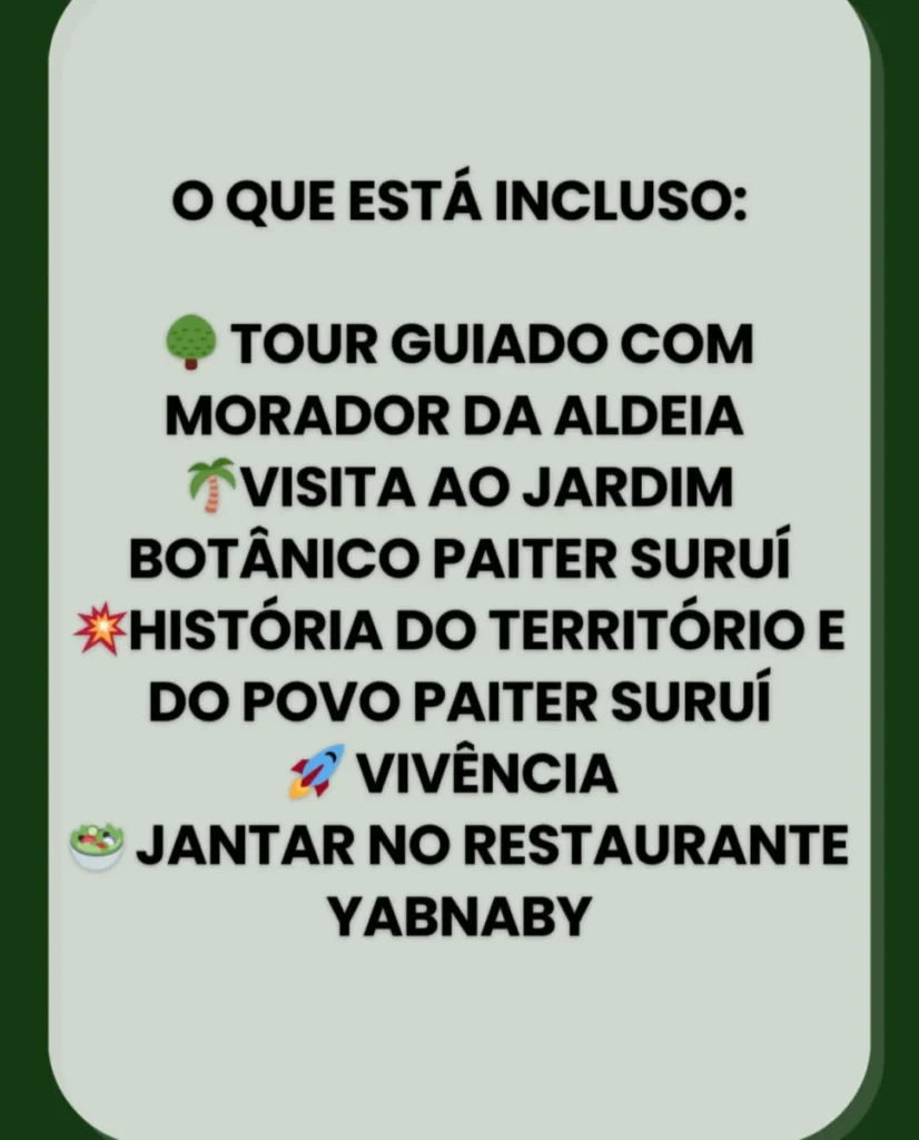 A atividade tem início às 15h30, com a chegada dos participantes ao espaço, que fica a cerca de 55 minutos do centro de Cacoal. A programação inclui um tour guiado com moradores da aldeia, visita ao Jardim Botânico Paiter Suruí, além de momentos de conversa cultural, onde os visitantes poderão conhecer mais sobre a história do território, tradições e o modo de vida indígena.